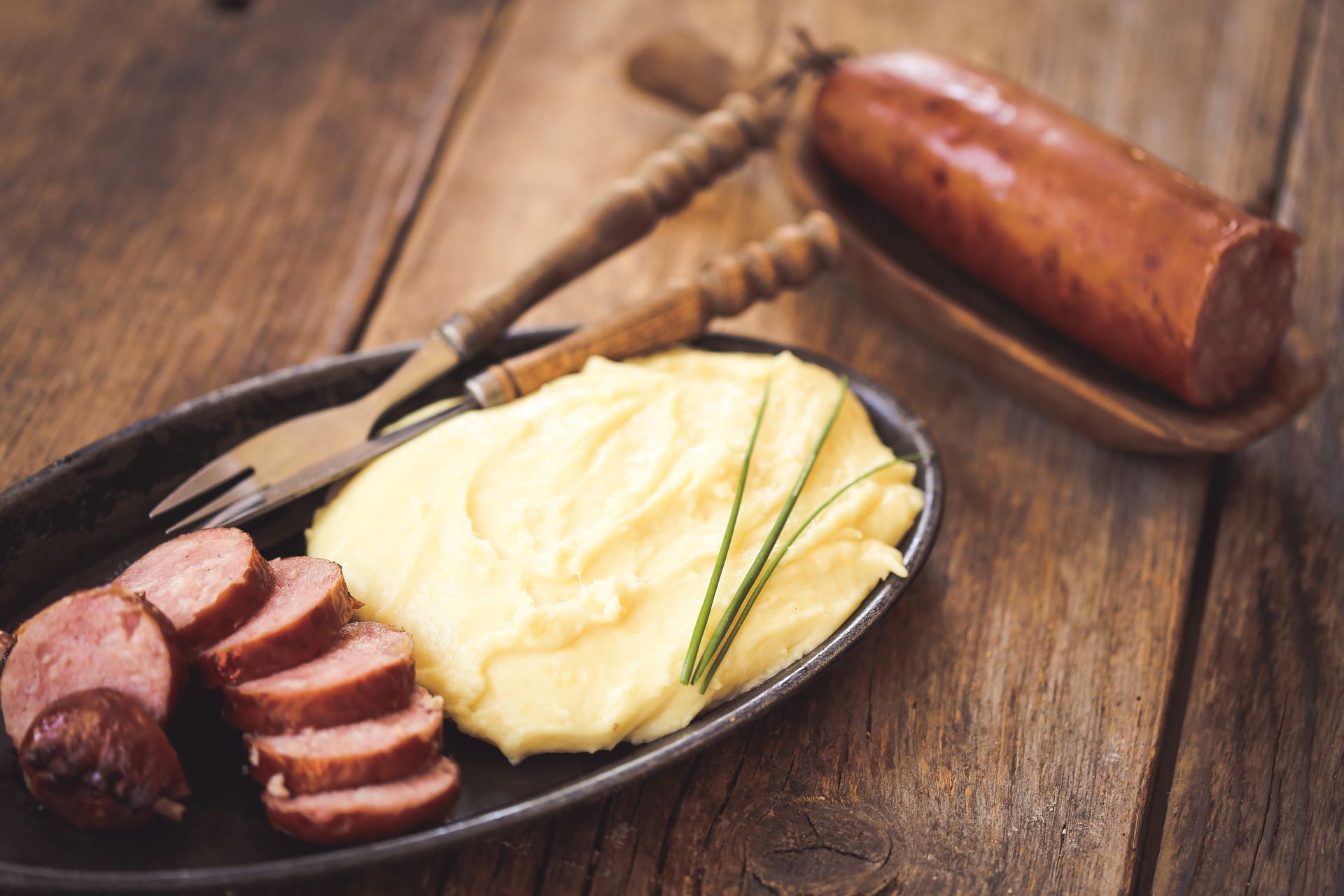 L'aligot est une spécialité culinaire rurale traditionnelle française originaire de l'Aubrac, à cheval sur l'Aveyron, le Cantal et la Lozère. À base de purée de pommes de terre, de tome fraîche ou "tome d'aligot", de crème, de beurre et d'ail, accompagné de saucisse.
